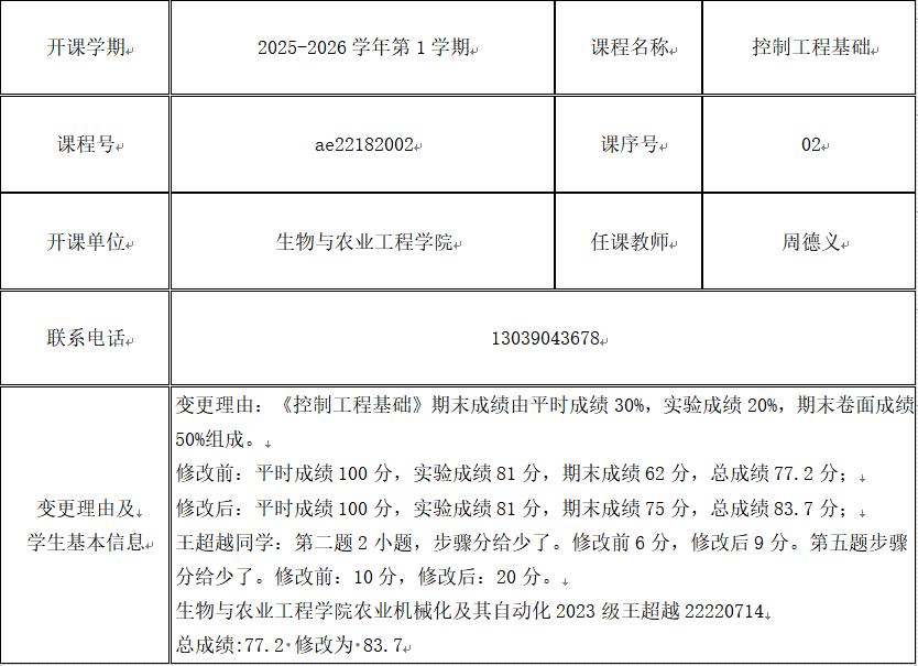 根据《关于进一步明确本科生课程考核等有关问题的通知》(校教字[2018]47号)文件有关精神,现对以下课程成绩更正进行公示: